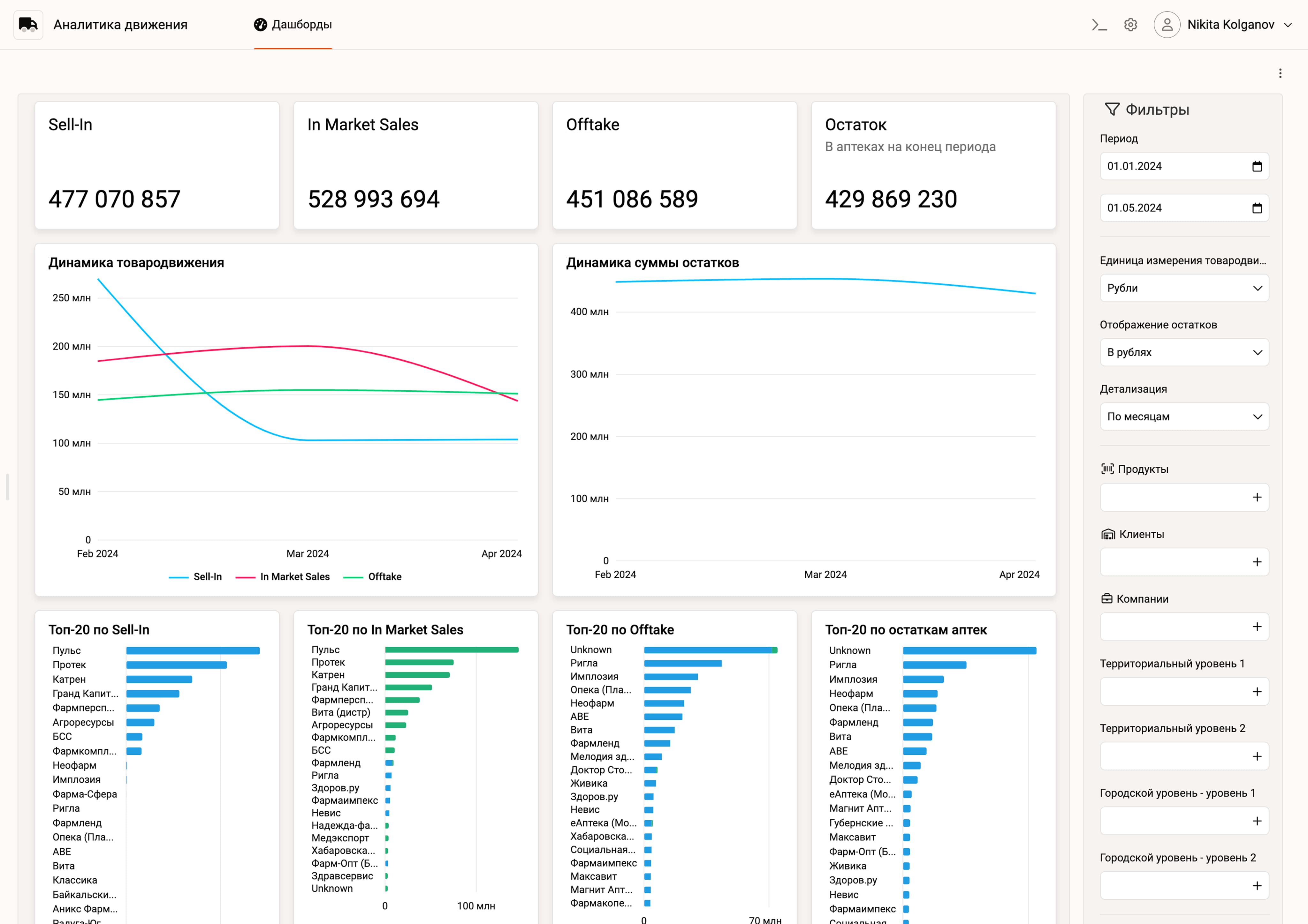 Строим модель движения товара по данным МДЛП. Вы видите, сколько товара пришло в рынок, сколько дошло до торговых точек и сколько было продано в рознице.