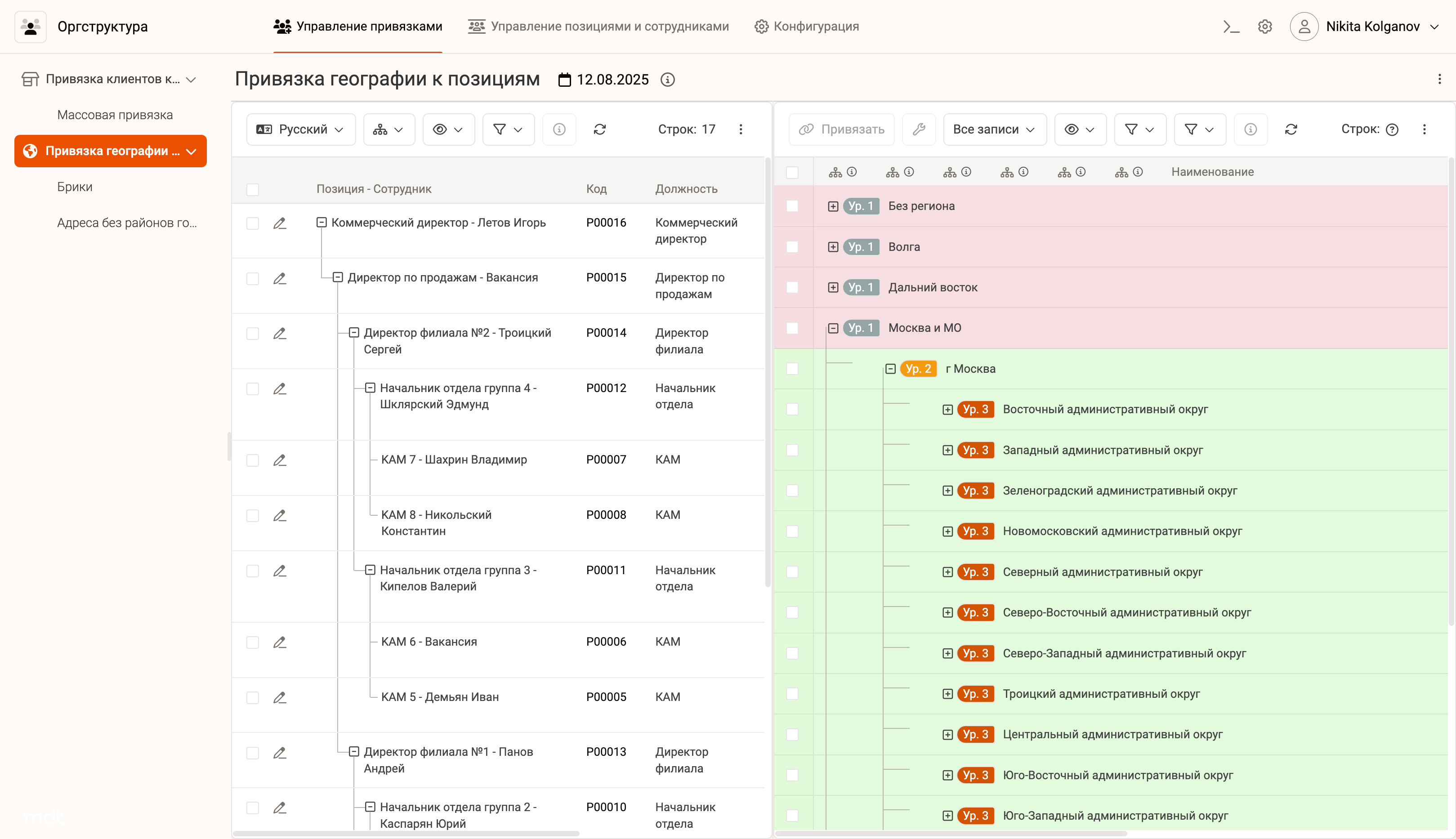 Задайте структуру команды и привяжите сотрудников к регионам. Aspect хранит историю назначений, благодаря чему аналитика корректна как за текущий, так и за прошлые периоды.