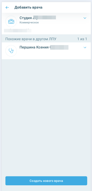 Когда добавляется новый врач, автоматически происходит проверка на совпадение по ФИО с уже существующими врачами по всем ЛПУ. Если есть совпадения, то приложение предложит привязать уже существующего врача к выбранному ЛПУ. Кликните на карточку найденного врача, чтобы раскрыть ее и увидеть свойства. Если вы уверены, что это новый врач, то нажмите на «Создать нового врача».