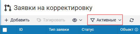 По умолчанию в узле Заявки на корректировку стоит фильтр Активные, который отображает только активные заявки. Активными заявками считаются заявки не в статусе Закрыто.
