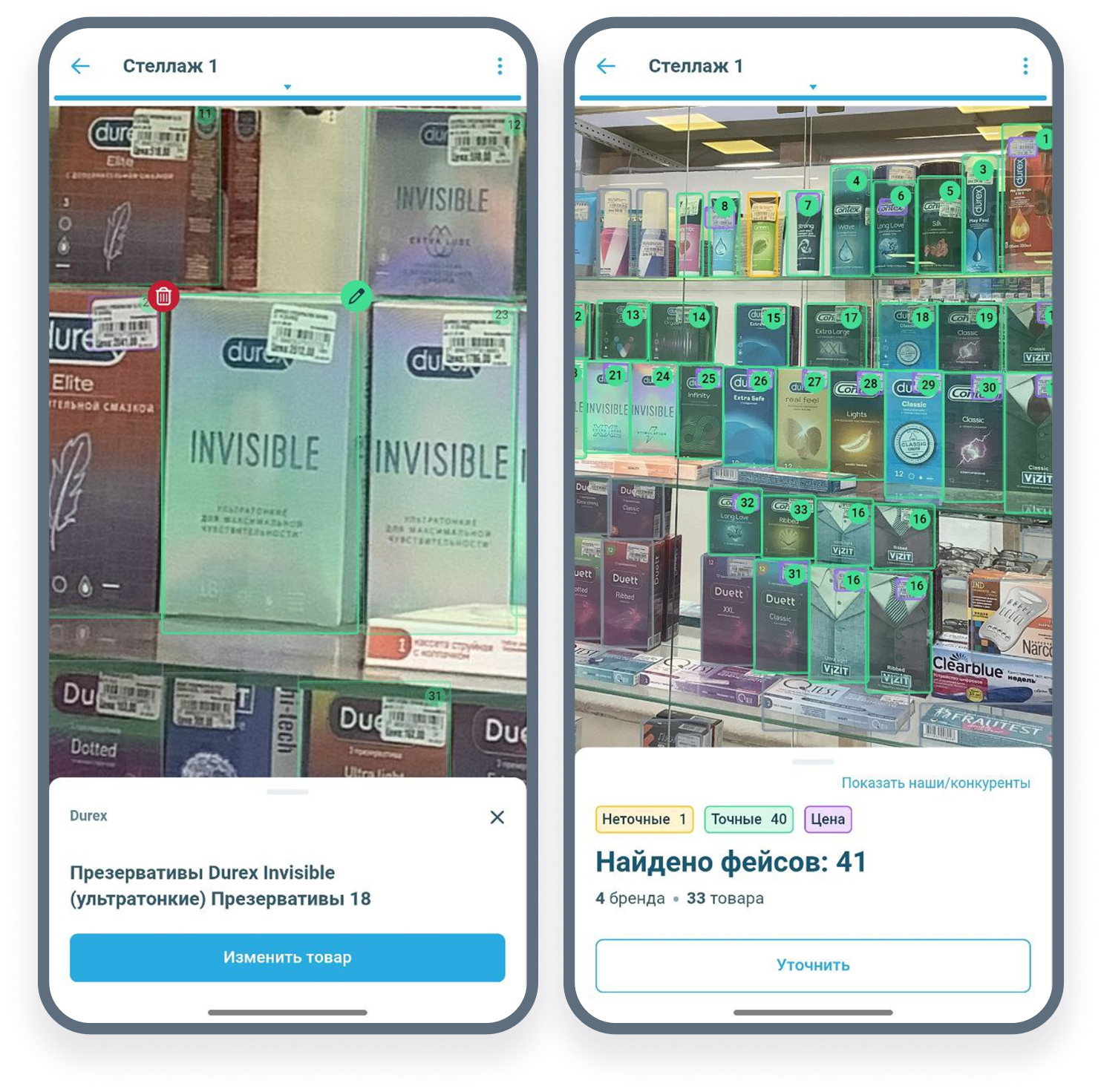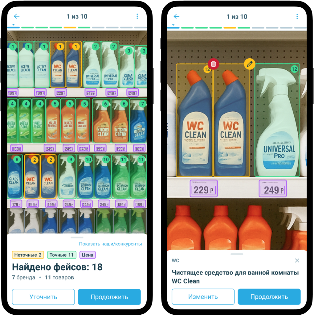 Быстрое распознавание на визите товаров, брендов и ценников как собственных товаров, так и конкурентов. Корректное определение размеров даже при очень похожих упаковках.
