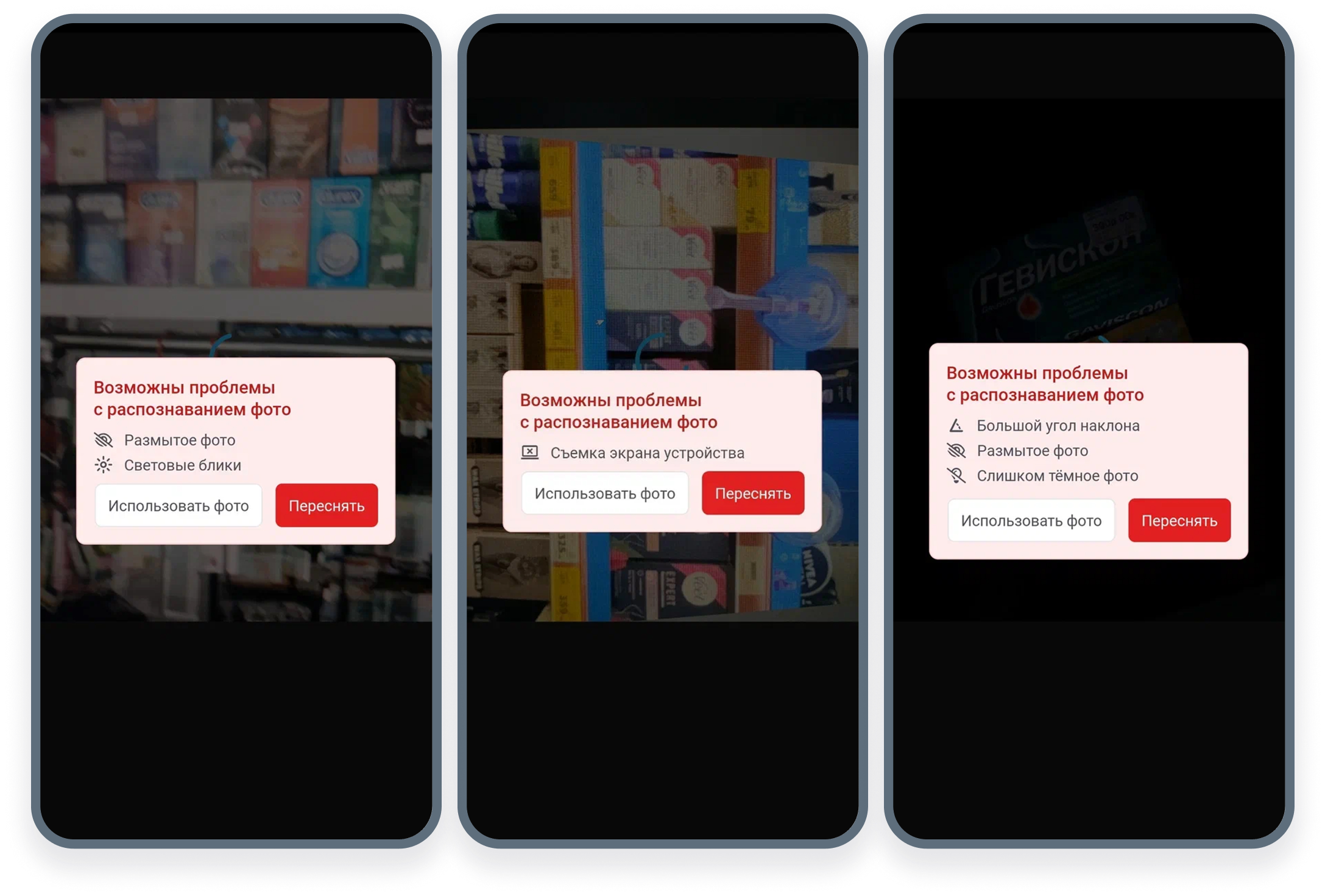 В камеру встроены проверки на блики, размытия, сильные углы наклона.