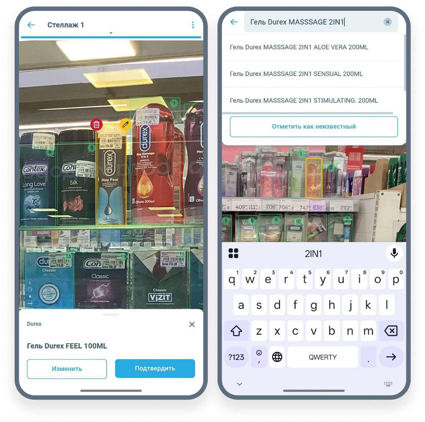 В сложных условиях распознавания подсвечиваем товары, чтобы уточнить их на визите для минимизации ошибок.