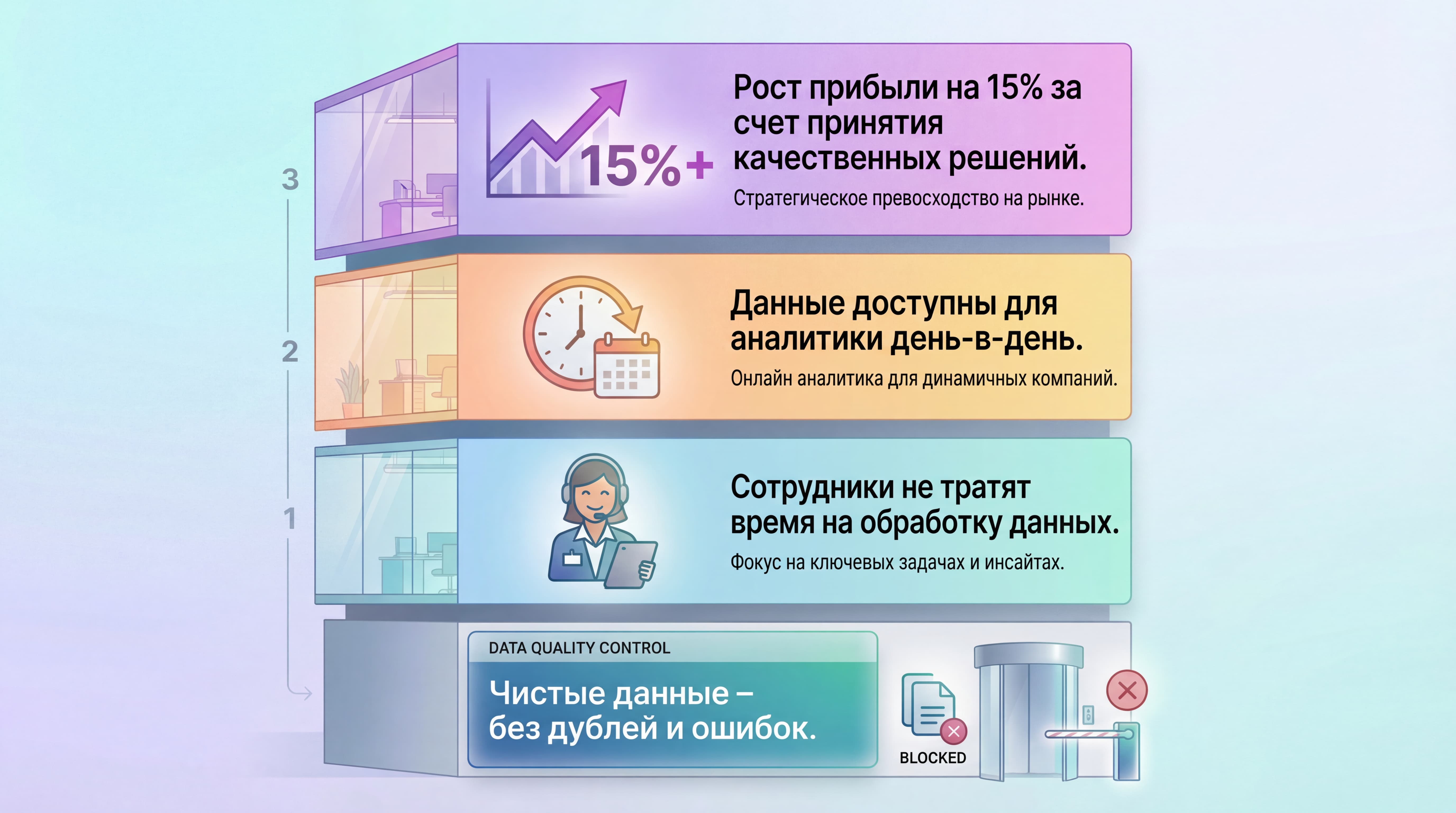 Аналитики перестают «чистить» массивы и концентрируются на выводах и рекомендациях. После этого управленческие решения принимаются на актуальной и надежной базе без задержек.