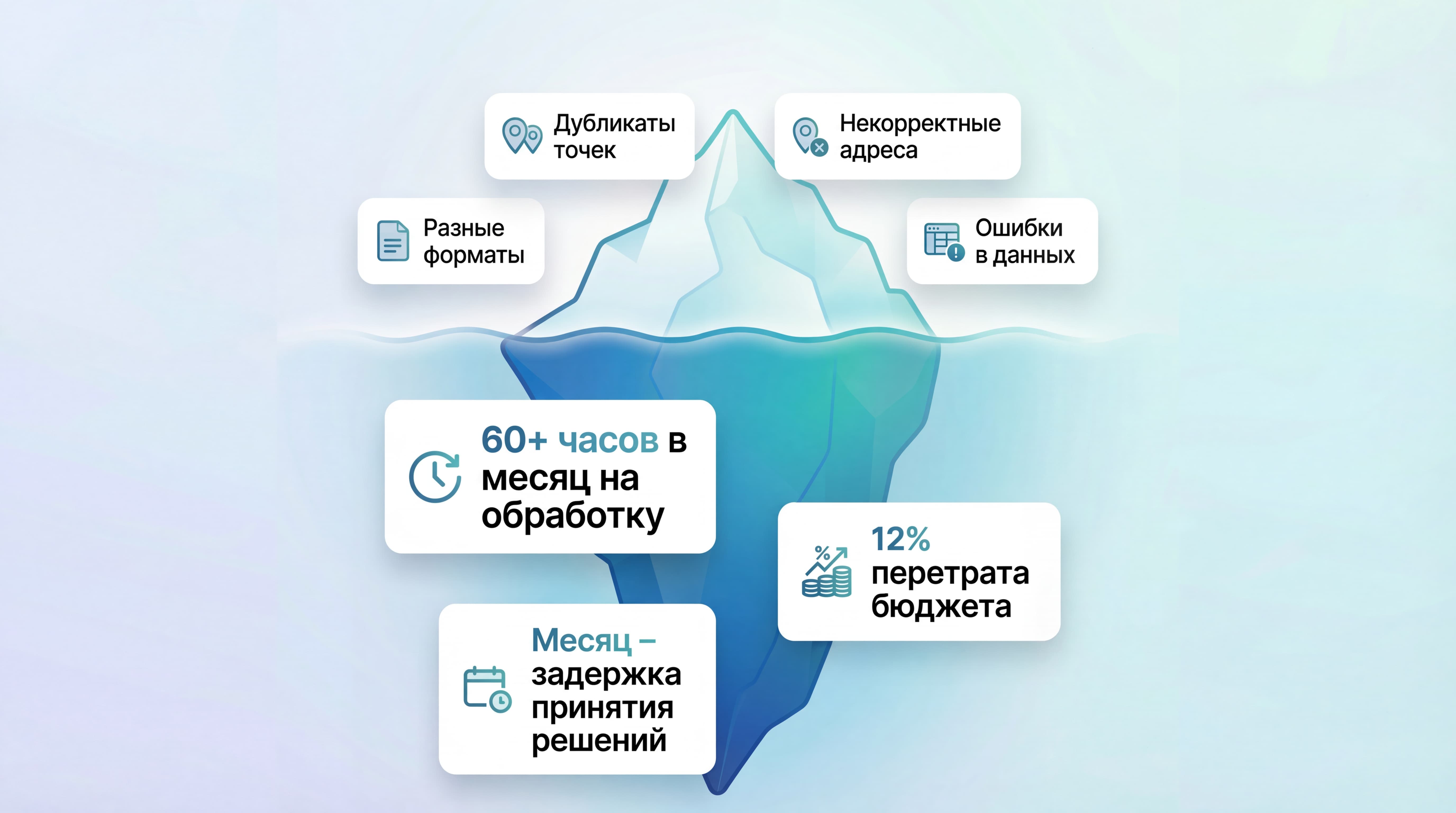 На входе: разноформатные отчеты, дубли торговых точек, некорректные или отсутствующие адреса, ошибки в ИНН.